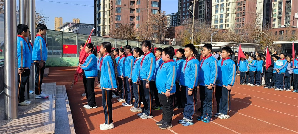 伴着《义勇军进行曲》激昂的旋律,五星红旗迎风飘扬。全体师生庄严肃穆,齐唱国歌,师生行注目礼,少先队员行队礼。