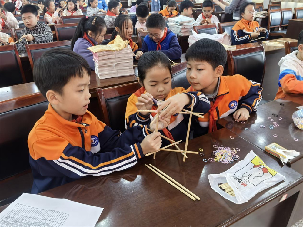 简单的几根筷子,经过同学们的设计搭建,变成了能撑持厚重书本的坚固装置。从设计到现场搭建再到角度调整,无不体现着孩子们的聪明才智。
