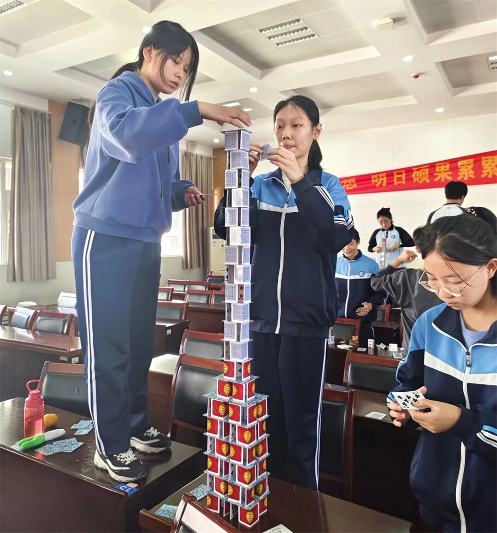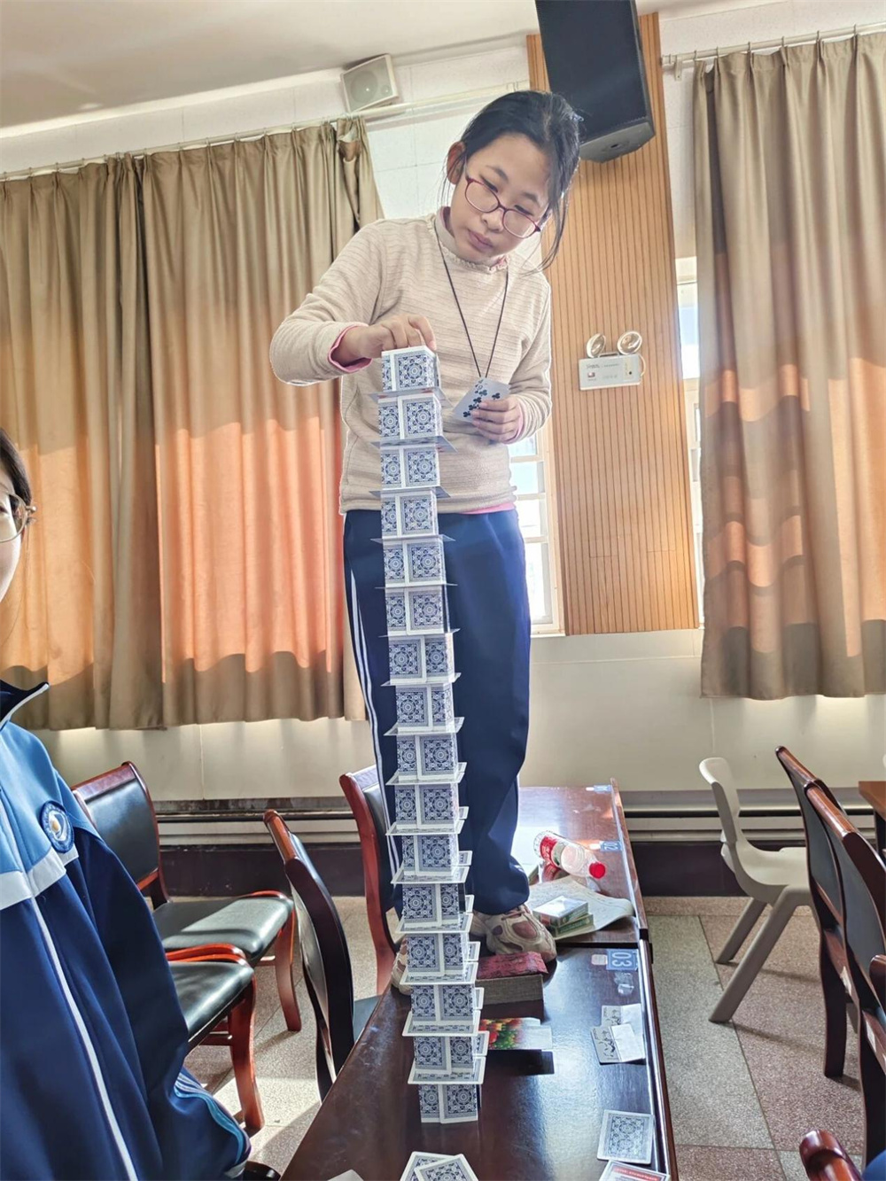 一副扑克牌可以搭多高?在扑克牌叠高的比赛现场会给你不同的答案。学生们三人为一个团队,发挥自己的奇思妙想,小心谨慎的进行搭建,一副扑克牌在他们手中变成一栋栋“摩天大楼”。