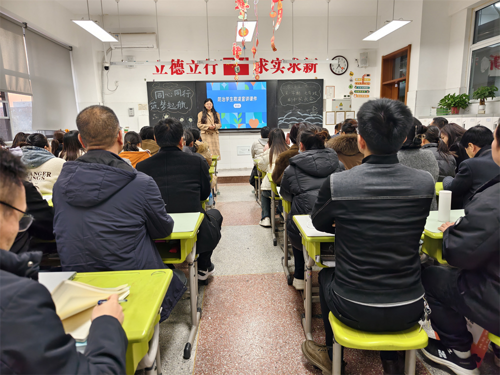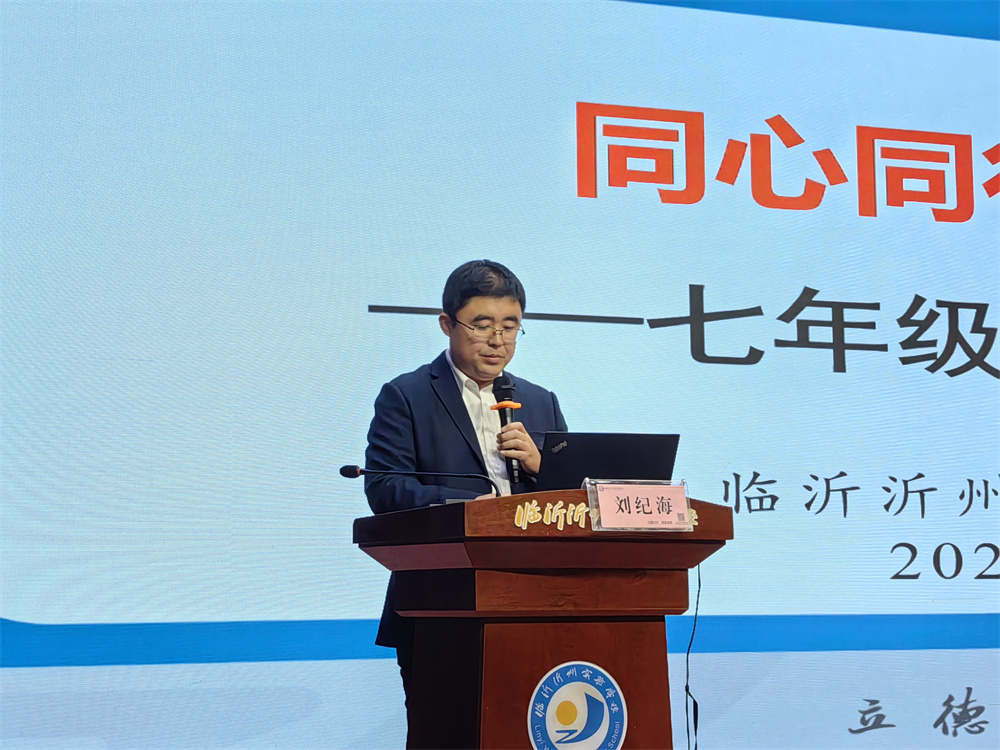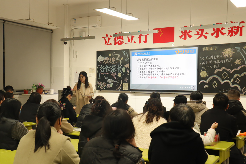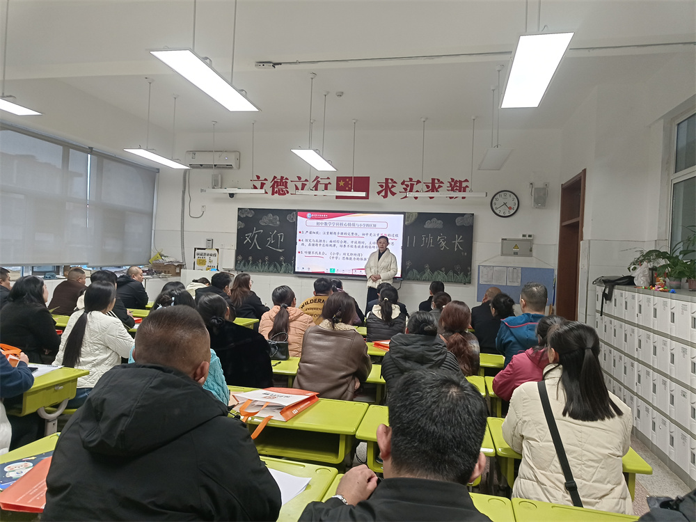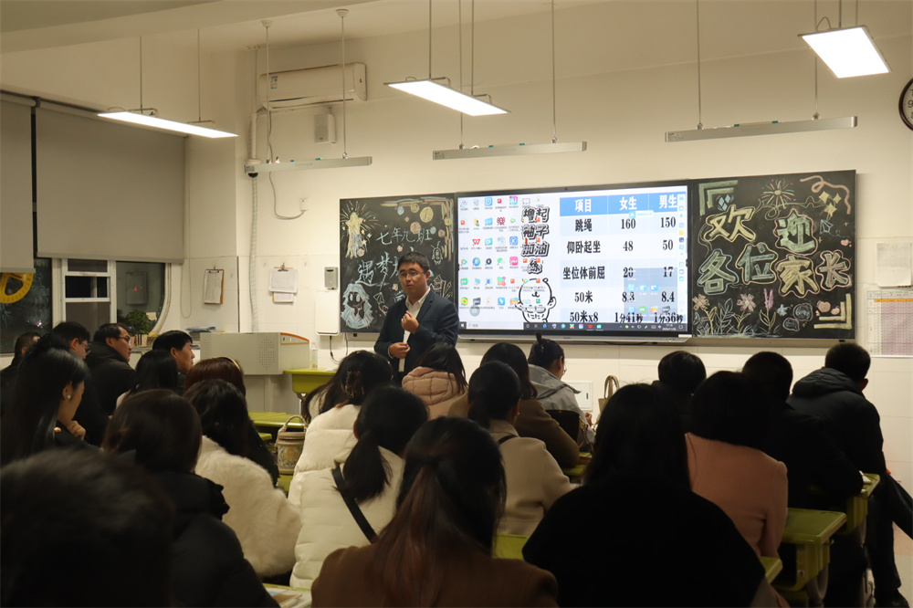 随后,七年级刘纪海主任以“同心同行,筑梦起航”为主题,汇报年级整体情况。他回顾新生国防教育实践与行为规范教育月两大入学课程实施成效,细数孩子们在学习习惯、思维方式、自主意识上的显著蜕变,也客观指出部分学生仍需加快适应初中生活节奏。在教师团队建设方面,刘主任介绍年级42名专任教师的优质配置,不仅具备扎实的课堂基本功与创新教学魄力,更斩获多项省市级教学奖项,专业实力备受认可。针对中考改革趋势,他解读政策优化背景与体育权重提升、命题侧重核心素养等变化,从学校全面发展培养、家长观念转变两方面给出应对策略,并发出家校共育倡议:聚焦习惯养成筑牢成长根基、坚定信任教师构建良好家校关系、严格管控手机合理规划时间、着力培养孩子自我管理能力。