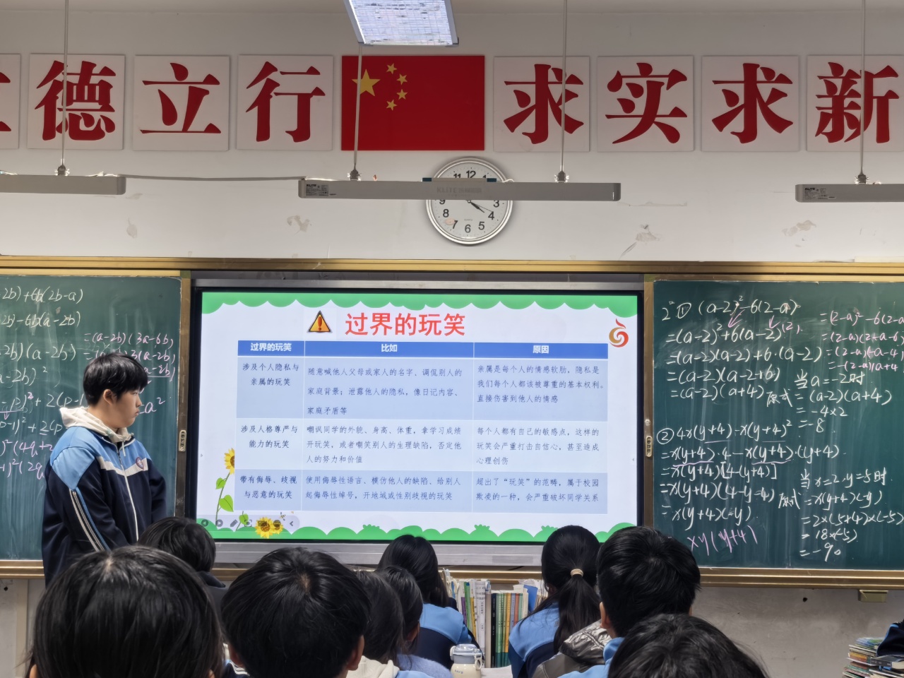 2025年12月5日下午,galaxy银河官网八年级开展了一场别开生面的心理健康教育班会。本次班会以“守玩笑边界,护友情成长”为主题,由心理老师姜秀梅通过广播统一讲解,各班班主任组织学生同步参与。班会旨在引导学生正确把握人际交往中的分寸,识别玩笑的边界,为构建和谐友爱的校园氛围奠定基础。